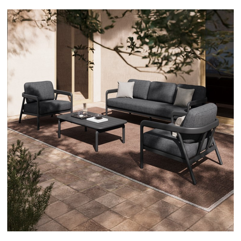Δημιουργήστε την ιδανική όαση χαλάρωσης στον εξωτερικό σας χώρο με αυτό το κομψό και λειτουργικό σετ επίπλων. Σχεδιασμένο για να προσφέρει άνεση και αντοχή, είναι η τέλεια επιλογή για να απολαύσετε τις ηλιόλουστες μέρες και τις δροσερές βραδιές στον κήπο, τη βεράντα ή την αυλή σας. Το σετ Marlena περιλαμβάνει 2 Πολυθρόνες 1 3θέσιο Καναπέ 1 Τραπέζι σαλονιού Τεχνικά χαρακτηριστικά: Σκελετός κατασκευασμένος από αλουμίνιο εξαιρετική ανθεκτικότητα σε φθορά και χρόνο σε ανθρακί χρώμα. Η επένδυση των δύο πολυθρόνων και του 3θέσιου καναπέ είναι ύφασμα ασυναγώνιστης ποιότητας σε ανθρακί. Περιλαμβάνει μαξιλάρια για την έδρα καθώς και την πλάτη και οι πολυθρόνες και ο καναπές, προσφέροντας την άνεση που χρειάζεστε. Το ύφασμα του μαξιλαριού είναι 340gsm πολυεστέρας υψηλής ποιότητας. Το τραπέζι είναι κατασκεασμένο από αλουμίνιο σε ανθρακί χρώμα. Διαστάσεις προϊόντων: Καναπές: Μήκος: 212 εκ. Πλάτος: 81,5 εκ. Ύψος: 64 εκ. Πολυθρόνα: Μήκος: 76 εκ. Πλάτος: 81,5 εκ. Ύψος: 64 εκ. Τραπεζάκι: Μήκος: 120 εκ. Πλάτος: 66,1 εκ. Ύψος: 37,5 εκ. Μέγεθος κυρίως σωλήνα: 60x15x1.2 εκ, 50x20x1.2 εκ Βάθος έδρας ωφέλιμο: 45 εκ. Ύψος μαξιλαριού πλάτης: 43 εκ. Ύψος έδρας: 46 εκ.