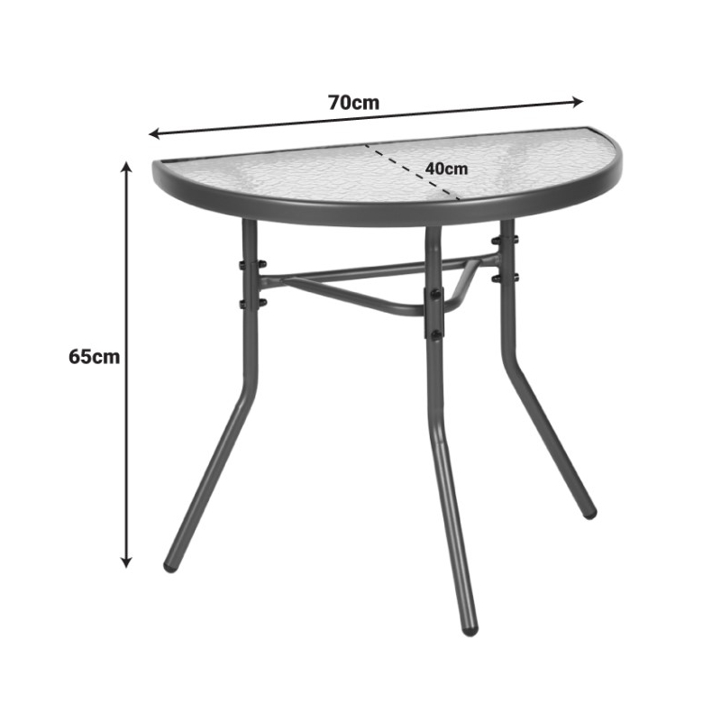 Μετατρέψτε το μικρό σας μπαλκόνι στην αγαπημένη σας γωνιά χαλάρωσης! Το ημικυκλικό τραπέζι Bion είναι ο τέλειος συνδυασμός στυλ και λειτουργικότητας. Ο έξυπνος σχεδιασμός του σάς επιτρέπει να το τοποθετήσετε ακριβώς πάνω στον τοίχο, δημιουργώντας μια φιλόξενη γωνιά για τον πρωινό σας καφέ ή το απογευματινό σας ποτό, χωρίς να θυσιάσετε πολύτιμο χώρο. Η ανθεκτική του κατασκευή με μεταλλικό σκελετό και γυάλινη επιφάνεια το καθιστά ιδανικό για όλη τη διάρκεια του χρόνου. Τεχνικά χαρακτηριστικά: Σταθερός σκελετός από ατσάλι με αντοχή στην καταπόνηση και στη φθορά. Επιφάνεια κατασκευασμένη από κυματιστό tempered glass που προσθέτει μια μοναδική οπτική υφή, θυμίζοντας απαλούς κυματισμούς νερού. Προσφέρεται σε καφέ χρώμα σκελετού με διάφανη επιφάνεια γυαλιού. Διάσταση προϊόντος: Μήκος: 70 εκ Πλάτος: 40 εκ Ύψος: 65 εκ Μέγιστο Βάρος Αντοχής: 70 κιλά