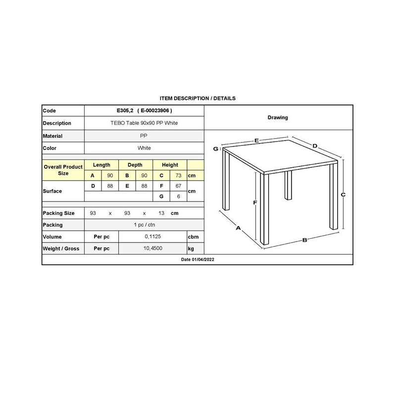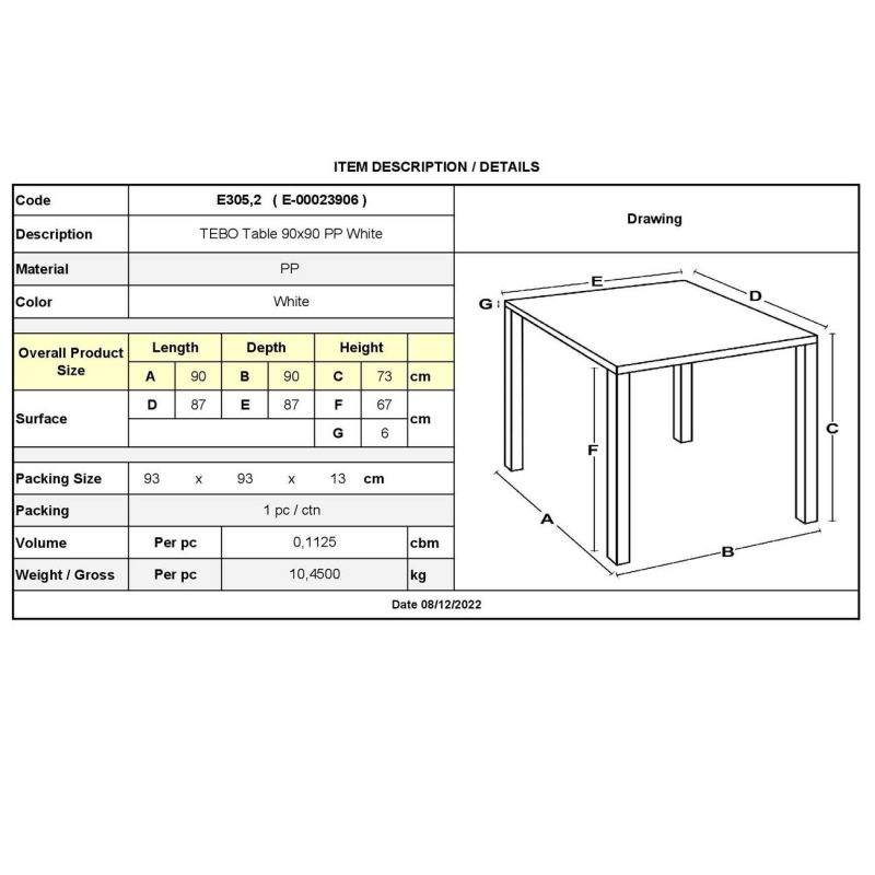 Ε305,2 TEBO Τραπέζι 90x90cm PP Άσπρο