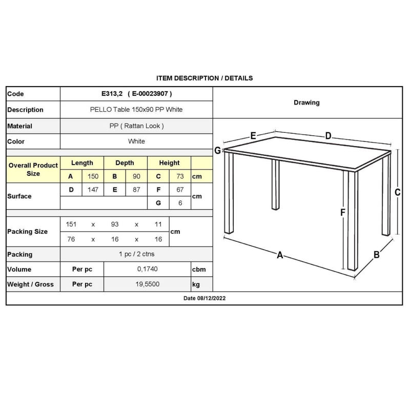 Ε313,2 PELLO Τραπέζι 150x90cm PP Άσπρο