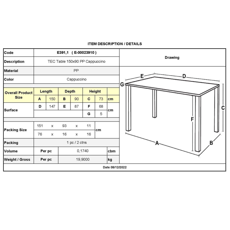 Ε391,1 TEC Τραπέζι 150x90cm PP Cappuccino