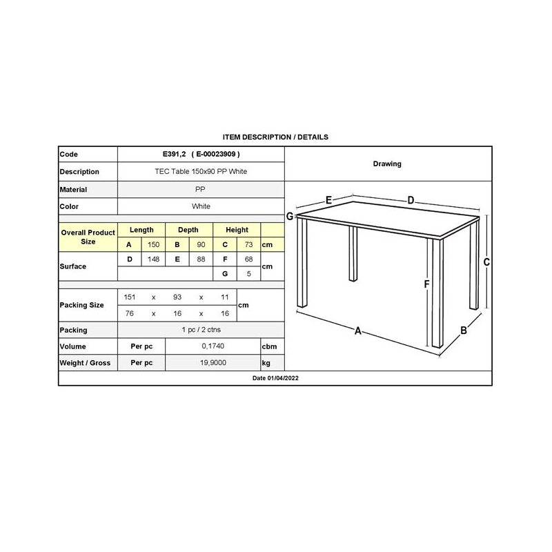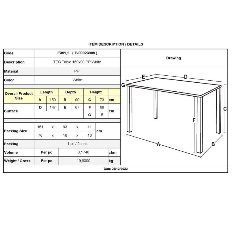 Ε391,2 TEC Τραπέζι 150x90cm PP Άσπρο