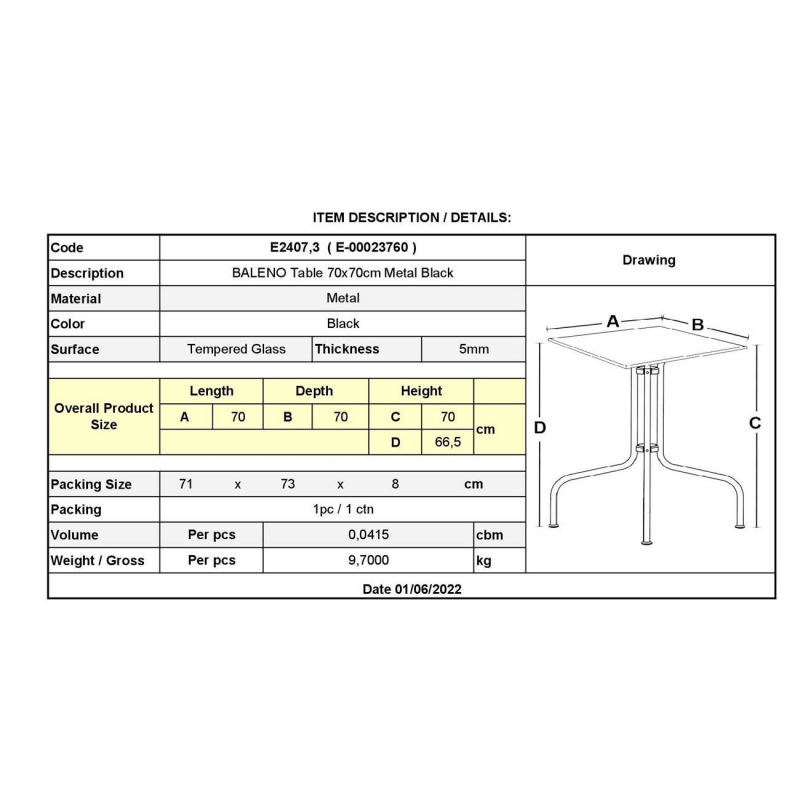 Ε2407,3 BALENO Τραπέζι 70x70cm Μεταλλικό Μαύρο