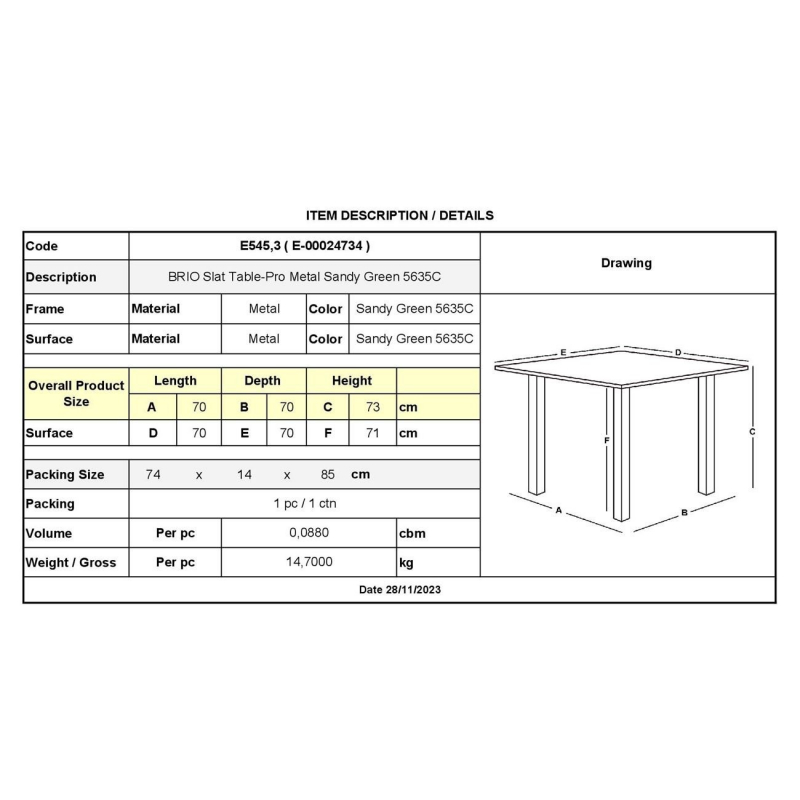 BRIO Slat Τραπέζι-Pro Κήπου - Βεράντας, Μέταλλο Βαφή Sandy Green 5635C 70x70x73cm