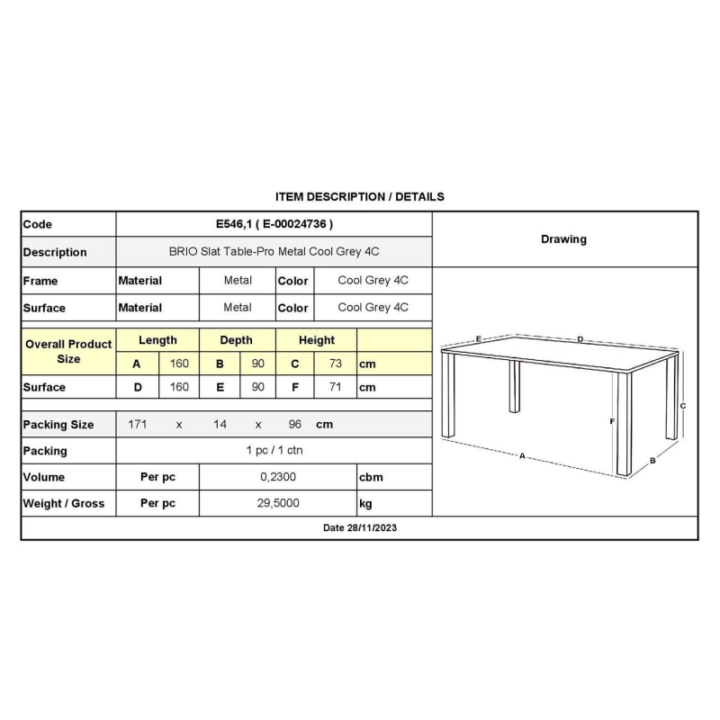BRIO Slat Τραπέζι-Pro Κήπου - Βεράντας, Μέταλλο Βαφή Cool Grey 4C 160x90x73cm