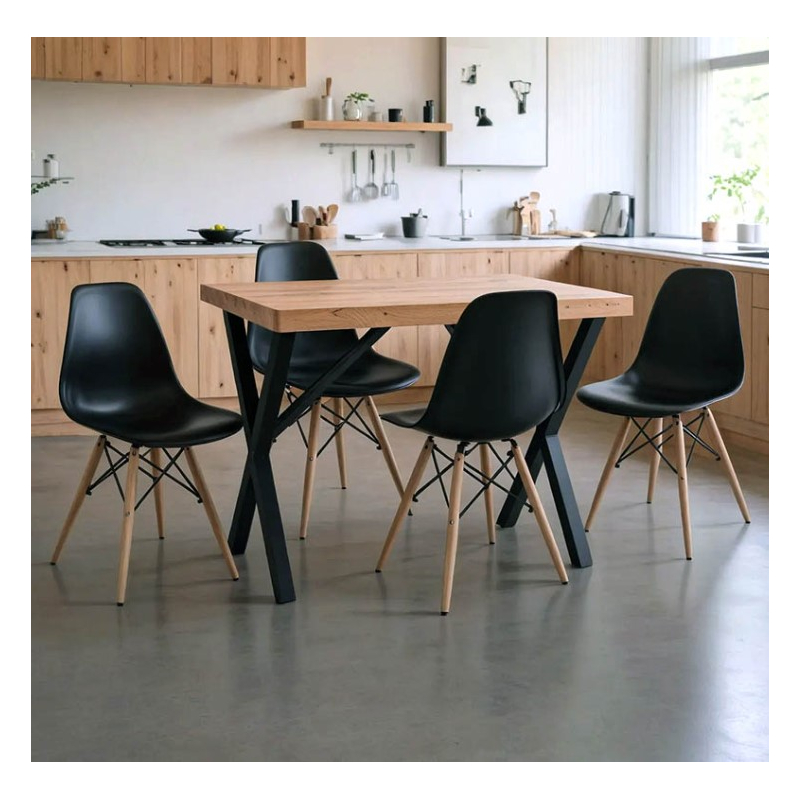Αναβαθμίστε την κουζίνα ή την τραπεζαρία σας με αυτό το μοντέρνο και λειτουργικό σετ , σχεδιασμένο για να προσφέρει στυλ και πρακτικότητα, ακόμη και σε περιορισμένους χώρους. Συνδυάζοντας την ανθεκτικότητα με την αισθητική, είναι η ιδανική επιλογή για το χώρο σου! Το σετ περιλαμβάνει 5 τεμάχια: 1 τραπέζι Τεχνικά χαρακτηριστικά: Σταθερός σκελετός από μέταλλο εξαιρετικής ποιότητας και κυρίως επιφάνεια από μοριοσανίδα με επένδυση μελαμίνης αντοχής στη φθορά και στο χρόνο. Η μοριοσανίδα μελαμίνης είναι ένα είδος ξύλινης σανίδας που κατασκευάζεται με εφαρμογή μελαμίνης, μια συνθετική ρητίνη, στην επιφάνειά της. Η μελαμίνη προσδίδει αντοχή στη σανίδα ενώ παράλληλα την κάνει ανθεκτική σε γρατζουνιές, υγρασία και άλλες καθημερινή χρήση. Προσφέρεται σε χρώμα oak-μαύρο. Οι καταλήξεις των ποδιών φέρουν προστατευτικά καλύμματα. Διαστάσεις: Μήκος: 110 εκ. Πλάτος: 70 εκ. Υψος: 75 εκ. και 4 καρέκλες Τεχνικά χαρακτηριστικά καρέκλας: Πλάτη και έδρα ενιαία κατασκευασμένη από πολυπροπυλένιο (PP) 1900g/m³ (100% ανακυκλώσιμο υλικό) με μεγάλη ανθεκτικότητα στην αντοχή και στη φθορά. Ο σχεδιασμός της στηρίζει την μέση και την σπονδυλική στήλη. Προσφέρεται σε μαύρο χρώμα. Στήριξη σε 4 ενισχυμένα ξύλινα πόδια οξιάς, ενοποιημένα με μαύρους μεταλλικούς βραχίονες, εξαιρετικής ποιότητας και αντοχής στο βάρος όσο και στο χρόνο. Οι καταλήξεις των ποδιών διαθέτουν προστατευτικά πλαστικά καλύμματα για την προστασία του πατώματος από ανεπιθύμητες φθορές. Διάσταση καρέκλας: Μήκος: 46 εκ. Πλάτος: 50 εκ. Ύψος: 82 εκ.