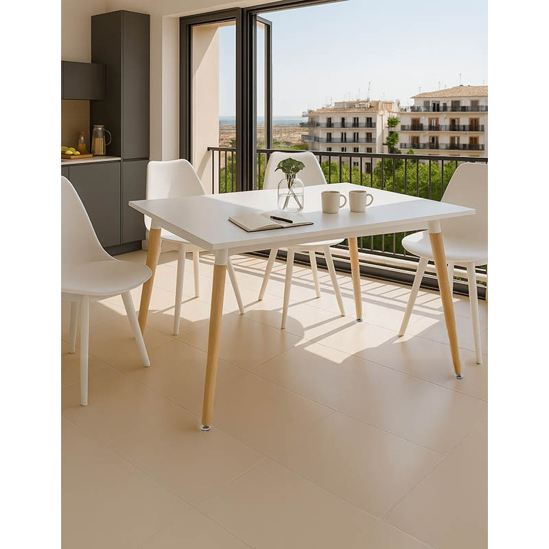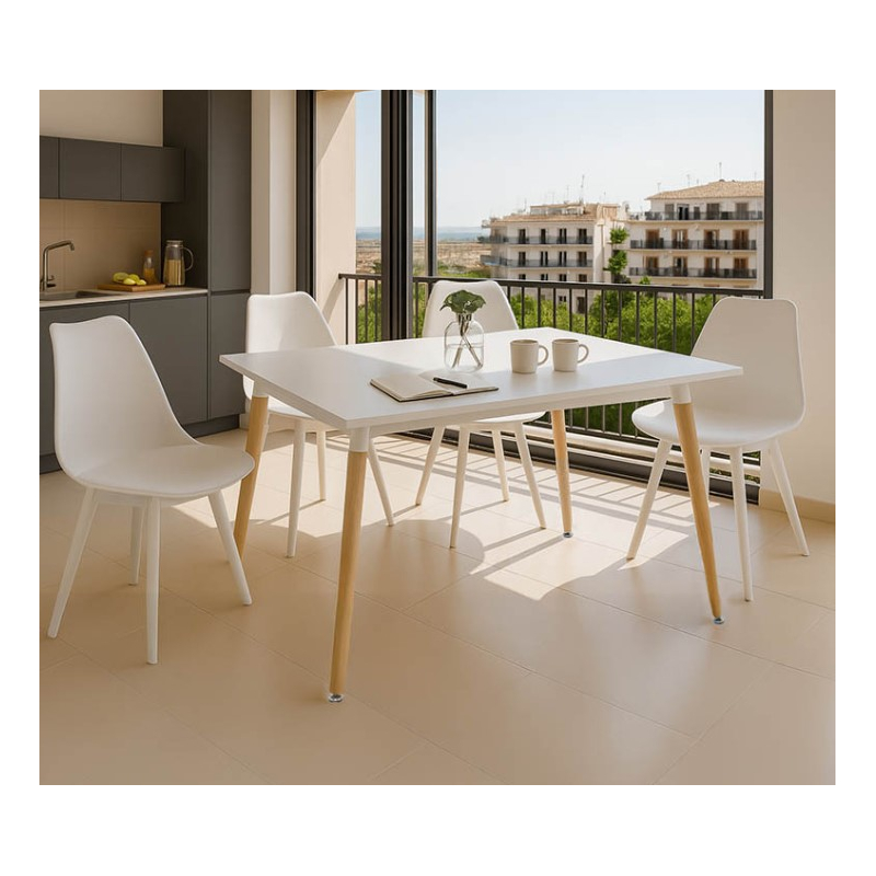 Ένα ευέλικτο σετ τραπεζαρίας προσαρμόσιμο σε μικρούς χώρους για σένα που θελεις να επιλέξεις και ποιότητα και καλύτερη τιμή . Δικό σου απλά με ένα click. Σετ πέντε τεμαχίων: Τραπέζι Natali pakoworld MDF λευκό-πόδια φυσικό 120x80x76εκ Τεχνικά χαρακτηριστικά τραπεζιού: Επιφάνεια κατασκευασμένη από υψηλής ποιότητας MDF (16mm) σε λευκό χρώμα που αφήνει μία σατινέ αίσθηση. Στήριξη σε 4 ενισχυμένα ξύλινα πόδια οξιάς (40mm) εξαιρετικής ποιότητας και αντοχής στο βάρος και στο χρόνο. Οι καταλήξεις των ποδιών διαθέτουν προστατευτικά πέλματα για την προστασία του πατώματος από ανεπιθύμητες φθορές. Επίσης τα φέρουν την δυνατότητα περιστροφής και ρύθμισης του ύψους, ανάλογα με την κλίση του δαπέδου. Διάσταση προϊόντος: Μήκος: 120 εκ Πλάτος: 80 εκ. Ύψος: 76 εκ. Καρέκλα Gaston I pakoworld PP-PU σε λευκή απόχρωση 48.5x53.5x81.5εκ Τεχνικά χαρακτηριστικά: Επένδυση με τεχνόδερμα εξαιρετικής ποιότητας . Η καμπύλη πλάτη και το μαλακό κάθισμα προσφέρουν μια αίσθηση άνεσης και στυλ. Στήριξη σε τέσσερα πόδια ίδιου χρώματος που είναι κατασκευασμένα από πολυπροπυλένιο (PP) με μεγάλη ανθεκτικότητα και αντοχές στη φθορά Προσφέρεται σε λευκό χρώμα. Διάσταση προϊόντος: Μήκος: 48.5εκ. Πλάτος: 53.5 εκ. Ύψος: 81.5 εκ. Ύψος έδρας: 46.5 εκ
