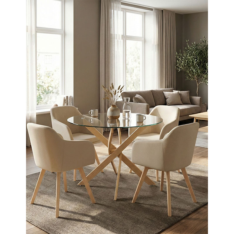 Τραπεζαρία με Πολυθρόνες Safira μπεζ και Τραπέζι Antoro γυαλί Φ100x75εκ Σετ 5τεμ