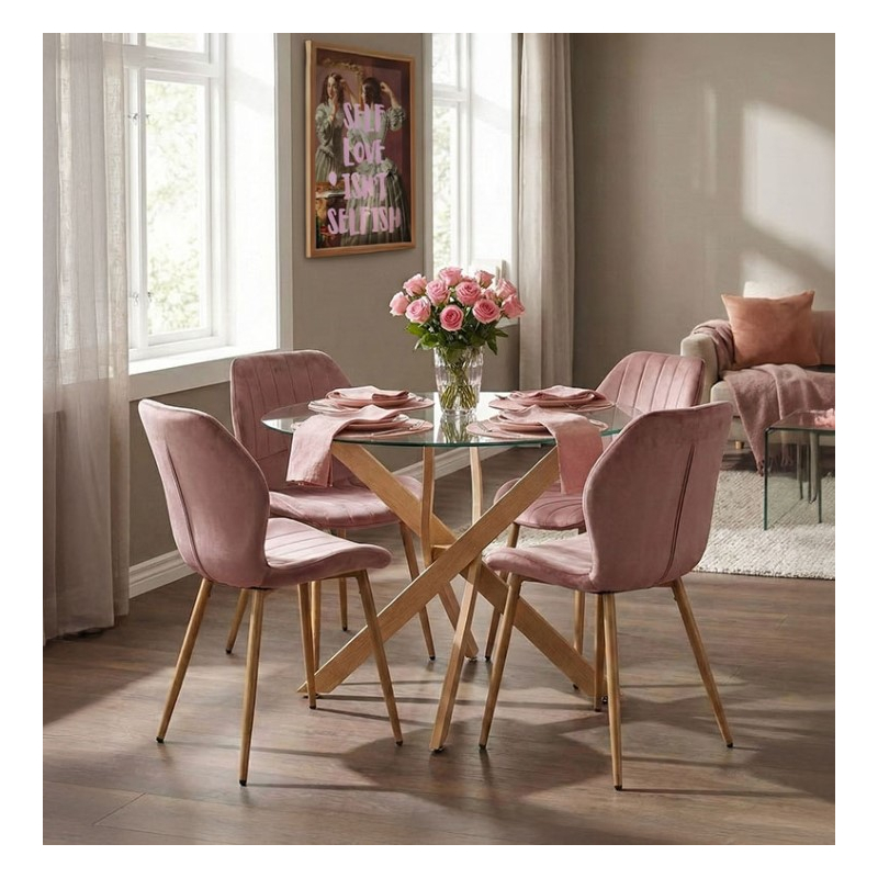 Ψάχνεις μια τραπεζαρία που να συνδυάζει κομψότητα, αφαιρετικό design και minimal αισθητική; Αν ναι, τότε το σετ Antoro-Jelour είναι για σένα. Σύγχρονο, ανθεκτικό και καλαίσθητο. Ιδανικό για το σπίτι αλλά και για τον επαγγελματικό σου χώρο. Τεχνικά χαρακτηριστικά τραπεζιου: Επιφάνεια κατασκευασμένη από διαφανές γυαλί ασυναγώνιστης ποιότητας. Στήριξη σε ενισχυμένο μεταλλικό σκελετό εξαιρετικής ποιότητας με μεγάλη αντοχή σε βάρος και φθορά. Προσφέρεται σε χρώμα φυσικό. Διαστάσεις προϊόντος: Μήκος: 100 εκ. Πλάτος: 100 εκ. Ύψος: 75 εκ. Τεχνικά χαρακτηριστικά καρέκλας: Η επένδυση από βελούδο σε μια μοναδική απόχρωση του σάπιου μήλου προσφέρει μια αίσθηση πολυτέλειας και απαλότητας στην αφή. Σκελετός από μεταλλική κατασκευή υψηλής αντοχής και πόδια μεταλλικά σε φυσικό χρώμα. Το κάθισμα και η πλάτη χαρακτηρίζονται από διακριτικές ραφές , δημιουργώντας ένα ενδιαφέρον μοτίβο και ενισχύοντας την εργονομική υποστήριξη. Ενδείκνυται για εσωτερικούς χώρους, αλλά και για χρήση: γραφείου, καταλυμάτων, Airbnb. Διαστάσεις προϊόντος: Μήκος: 46.5 εκ. Πλάτος: 60 εκ. Ύψος: 84 εκ. Ύψος έδρας: 49 εκ.
