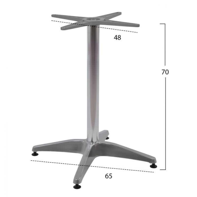 Βάση τραπεζιού τετράνυχη HM448.01 κατασκευασμένη από αλουμίνιο σε απόχρωση χρωμίου, με ρεγουλατόρους. Διαστάσεις στηρίγματος επιφάνειας: 45x45 εκ. Διαστάσεις βάσης: 66x66 εκ. Ύψος βάσης: 69Yεκ. Η Βάση ενδείκνυται για επιφάνεια Φ60cm ή 60x60cm ή Φ70cm ή 70x70cm. Σημαντική Σημείωση Προσοχή: Οι ξυλόβιδες που πιθανόν να περιέχονται στην συσκευασία για να βιδωθεί το καπάκι ενδέχεται να μην είναι κατάλληλες για το καπάκι που επιλέγετε. Ελέγχετε πάντα το ύψος της βίδας πριν βιδώσετε.
