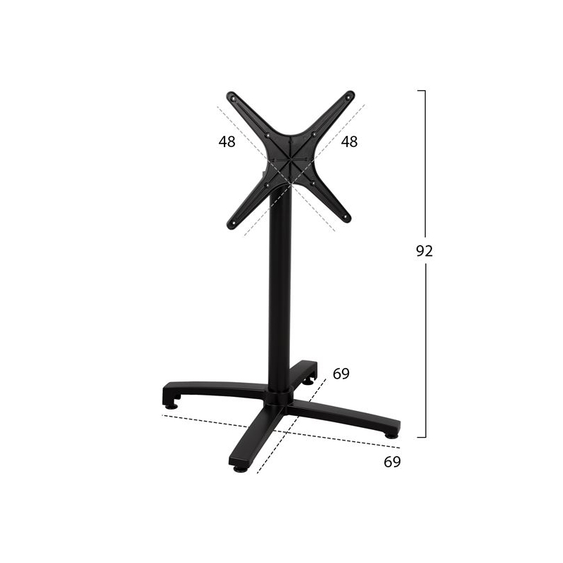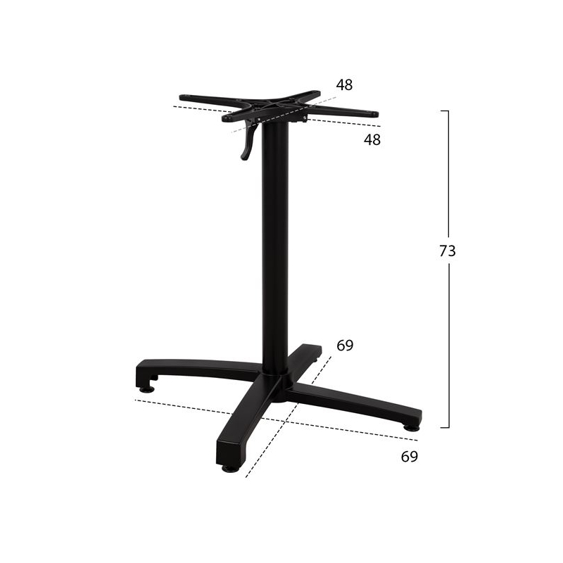 Βάση τραπεζιού HΜ459.01 κατασκευασμένη από αλουμίνιο σε μαύρη ματ απόχρωση, με ρεγουλατόρους. Βάση στήριξης πτυσσόμενη για ελάχιστο χώρο αποθήκευσης. Διαστάσεις στηρίγματος επιφάνειας: 48x48 εκ. Διαστάσεις βάσης: 69x69 εκ. Ύψος βάσης: 73Υεκ. με τη βάση στήριξης επιφάνειας σε οριζόντια θέση 92Υεκ. με τη βάση στήριξης επιφάνειας σε κάθετη θέση Η Βάση ενδείκνυται για επιφάνεια Φ60cm ή 60x60cm ή Φ70cm ή 70x70cm ή Φ80cm ή 80x80cm. Σημαντική Σημείωση Προσοχή: Οι ξυλόβιδες που περιέχονται στην συσκευασία για να βιδωθεί το καπάκι ενδέχεται να μην είναι κατάλληλες για το καπάκι που επιλέγετε. Ελέγχετε πάντα το ύψος της βίδας πριν βιδώστε.