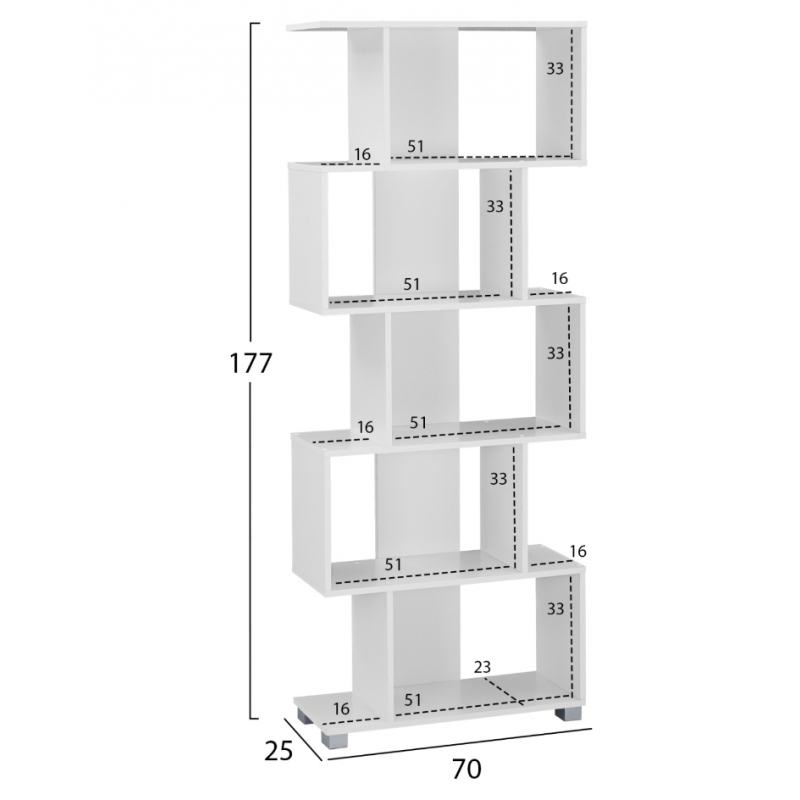 Βιβλιοθήκη κατασκευασμένη από μελαμίνη σε λευκή απόχρωση. Διαθέτει πέντε ράφια με κάθετα χωρίσματα. Η βιβλιοθήκη αποτελεί την καλύτερη επιλογή για εσάς που θέλετε να έχετε τα πάντα σε τάξη. Ο μοναδικός και μοντέρνος σχεδιασμός της μαγνητίζει τα βλέμματα και αναδεικνύει κάθε αντικείμενο που τοποθετείται πάνω της. Διαστάσεις: 70x25x177 εκ. Ράφι Α: 51x23x33 εκ. Ράφι Α.01: 16x23x33 εκ. Ράφι B: 51x23x33 εκ. Ράφι B.02: 16x23x33 εκ. Ράφι Γ: 51x23x33 εκ. Ράφι Γ.03: 16x23x33 εκ. Ράφι Δ: 51x23x33 εκ. Ράφι Δ.04: 16x23x33 εκ. Ράφι Ε: 51x23x33 εκ. Ράφι Ε.05: 16x23x33 εκ. Ύψος ποδιών: 3,5 εκ. Απόσταση ποδιών: 68x22 εκ. Το προϊόν διατίθεται αμοντάριστο σε πακέτο με αναλυτικές οδηγίες συναρμολόγησης.